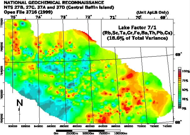 This apparently unlikely element association is unlikely to be directly related to geology, since Rb, Ba, Th, Pb and Cs tend to behave oppositely to Sc, Cr and Fe in the primary environment. It may, however, be related to glacial or post-glacial sedimentary processes, since scores of this factor show a rather strong positive correlation with both lake area and sample depth: the deeper the sample and the larger the lake, the higher the factor score.