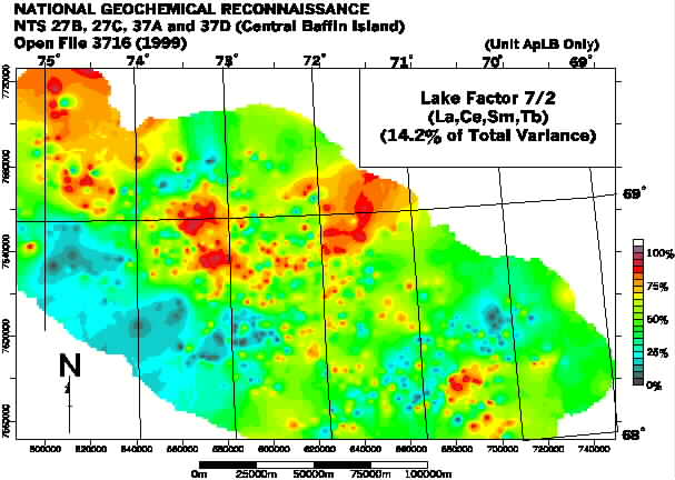 This factoris characterized by heavy loadings of the rare-earth elements La, Ce, Sm and Tb. The next-highest loadings, though less than the arbitrary cutoff of 0.5, are displayed by Yb at 0.493 (also a rare earth) and Th at 0.361. This suggests a granitic provenance to the lake sediment, although other variables that would be expected to correlate with the rare earths in such an environment, (U, U in water, Rb) have loadings of absolute value less than 0.2. Scores of this factor also show a positive correlation with sample depth but not with lake area.