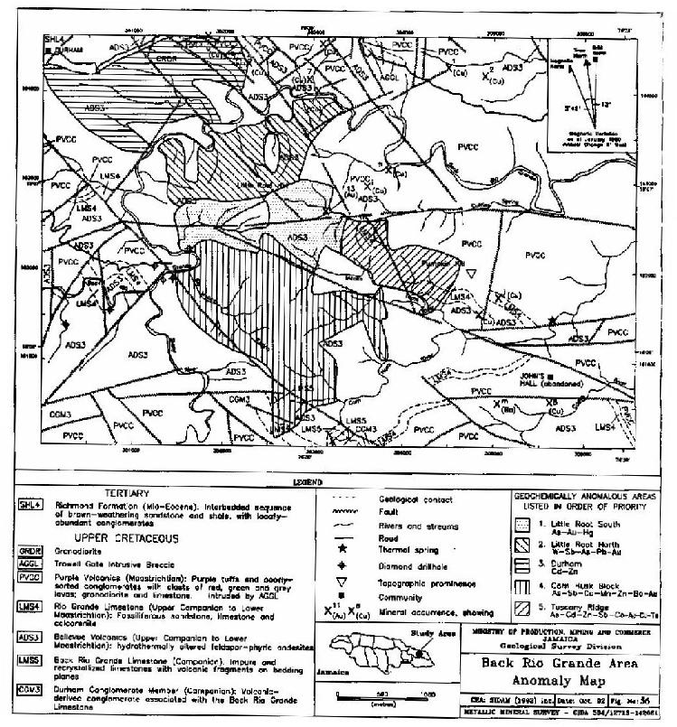 Five stream-sediment and heavy-mineral concentrate geochemical anomalies have been identified in an area of the lower Back Rio Grande, 10 km south-southwest of Port Antonio, in Portland Parish. They were discovered by a detailed follow-up study of a regional stream sediment and heavy-mineral concentrate anomaly in gold, arsenic, tellurium, antimony, copper and barium, identified during a reconnaissance geochemical survey of Jamaica's Cretaceous Inliers and the Early Tertiary Wagwater Trough, in 1986. Participants in the current studied included employees of the Jamaican Ministry of Production, Mining and Commerce (Geological Survey Division) and Canadian staff members of CIDA Project 504/12713-142061 (Metallic Minerals Survey -- Phase II) and of Canadian Executing Agency Le Groupe Minier SIDAM (1992) Inc.