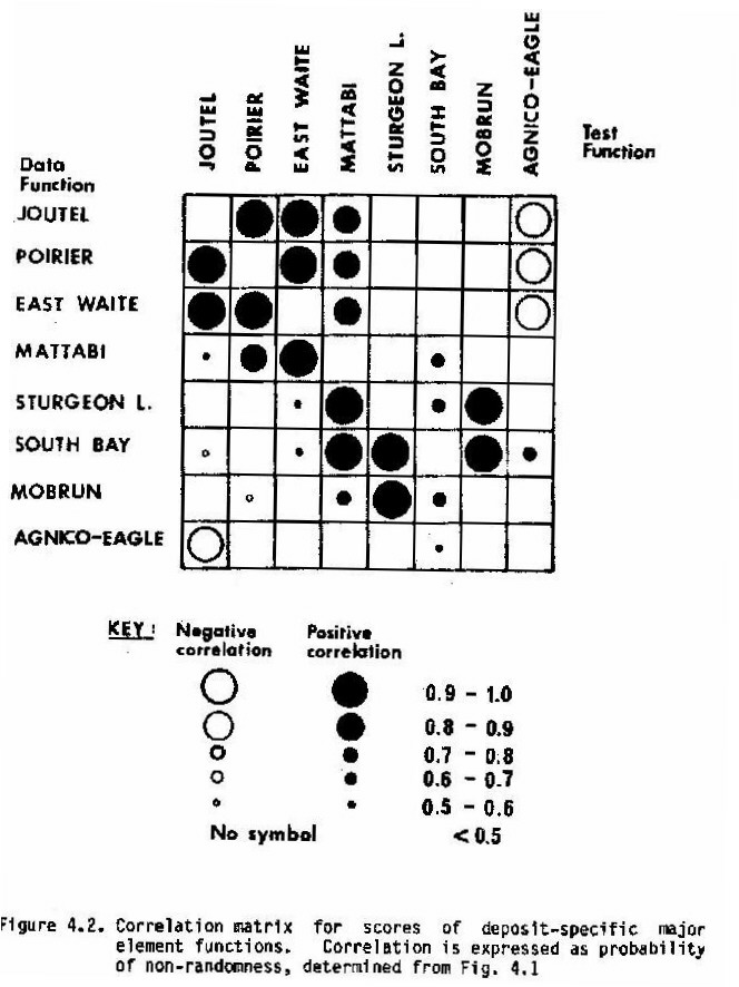 This investigation has consisted of a re-examination of the same analytical data. It was prompted by the recognition that while an unweighted linear combination of elements may define wallrock alteration haloes more effectively than any of its individual component elements, it does not necessarily maximize the distinction between rocks spatially associated with massive sulphide, and rocks remote from any mineralization. Such weighted combinations, termed discriminant scores, may be derived by using discriminant analysis, a multivariate statistical method based on a priori knowledge of the classification (anomalous or background) of the samples used to generate the functions and scores.