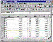 3 Data window opens automatically so data can be viewed and checked (NOTE: “Ag” in the first column refers to a rock unit; “AG” in the second column refers to an element (silver). All values are percentiles of total data set, previously calculated). |