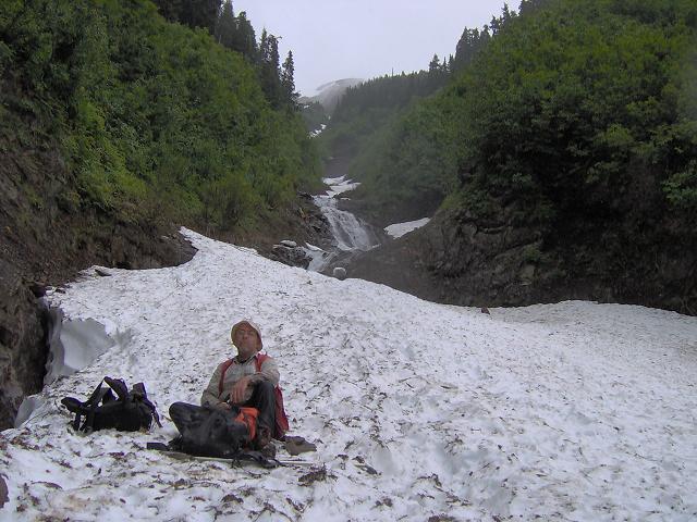 Snowfilled creek valley, north of Illiance Mountain. The snow makes climbing easier in the early part of the summer, but rapidly becomes difficult and hazardous as it melts.