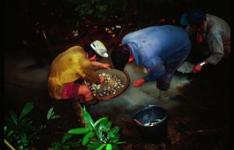 Preparing stream sediment for panning, Oelemari River Concession. The combined presence of kaolin (white suspended material) and quartz is generally an encouraging sign, and the sample in question returned approximately 100 gold colours.