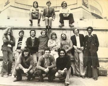 About half of Graduating Class, Geology 74: L-R Back: D. Leigh, W.P. Karpeta, S. Amor; L-R Middle: N. Wyver, G. Every,