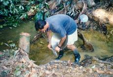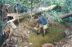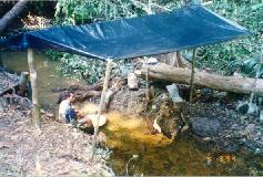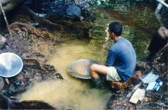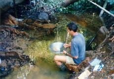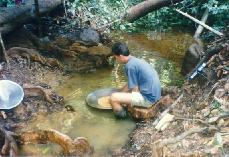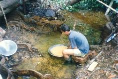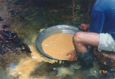 Brazilian "Superpanner" in action, Chicanans River. A semiquantitative gold assay on a stream-sediment, soil or saprolite sample is returned in less than one hour.