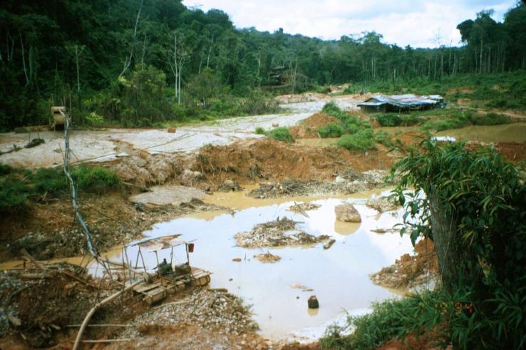 "Pork-knocker" (artisanal gold miner) workings, Benzdorp. The giant, derelict "Jungle Queen" gold dredge can be seen in the background