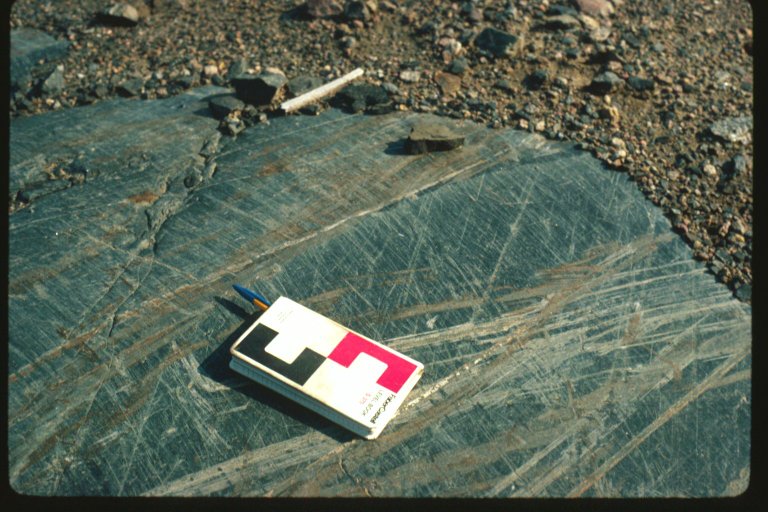 Glacial striations (and backhoe scrape marks) on metabasalt outcrop, Highway 391/Hughes River bridge