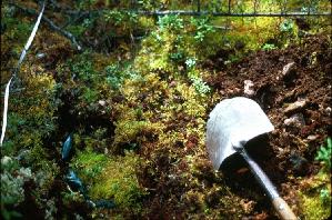 Installing "Aurex" soil mercury measurement device. In the third photograph, a garbage bag has been laid over the detector and the removed soil replaced until the detector is recovered one month later