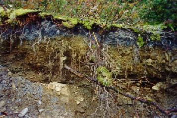 Volcanic ash layer in soil, Antler Creek, Central B.C.
